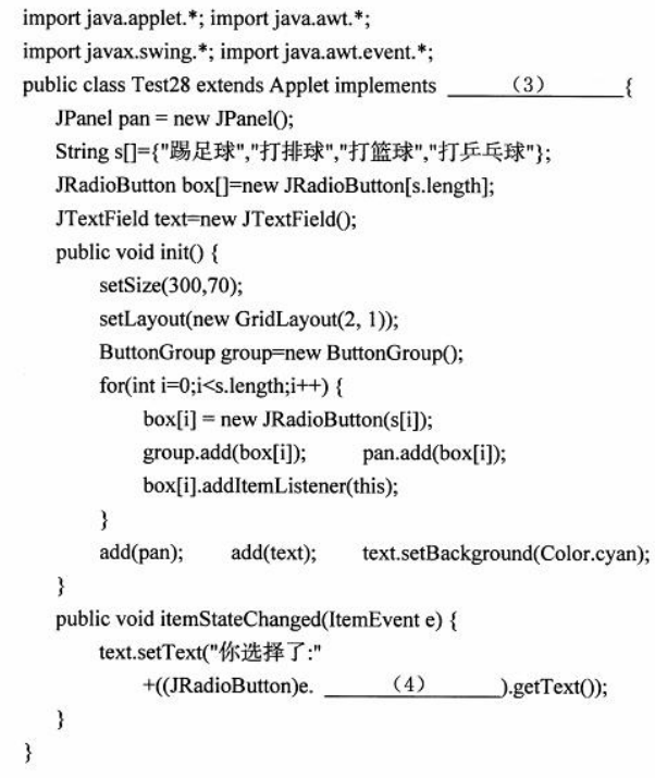 以下小应用程序设计了一个面板,面板中有四个运动项日单选按钮和一个文本框。当某个选择项目被选中时,在文本框中显示该选择项目。 作者:高老师 时间:2024-08-04 浏览 0 以下小应用程序设计了一个面板,面板中有四个运动项日单选按钮和一个文本框。当某个选择项目被选中时,在文本框中显示该选择项目。【正确答案】:ItemListenergetItemSelectable() 📱 扫码体验刷题小程序 扫一扫使用我们的微信小程序