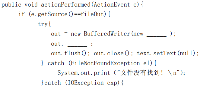 某个缓冲式输出的示意程序的界面有一个文本框fileOut和一个文本区text,程序运行时,先在文本区中输入要存入文件的内容,接着在文本框中输入文件名并回车,则程序将文本区中的内容保存到指定的文件中。以下是该程序中相应文本框文件名的输入事件的方法。