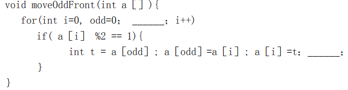 方法void moveOddFront(int a[])的功能是将数组a中的所有奇数都移到数组的前端,而把偶数放于所有奇数的后面,其方法是当发现是偶数时,就让该数留在原来位置,当发现是奇数时,就与前面的第一个偶数交换。程序引入变量odd表示移动过程中遇到的奇数个数。