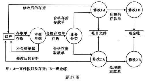 题37图是银行活期存取款业务处理系统的数据流图,请根据图示完成以下填空: (1)数据源或数据潭包括:________; (2)加工包括:________; (3)数据存储包括:________; (4)“业务分类”的输入流是:________; (5)“业务分类”的输出流是:________。