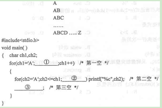 输出下列图形。 作者:高老师 时间:2024-08-04 浏览 1 输出下列图形。【正确答案】:第一空:ch1<='Z'第二空:ch2++(或++ch2或ch2=ch2+1或ch2+=1)第三空:printf("\n") 📱 扫码体验刷题小程序 扫一扫使用我们的微信小程序