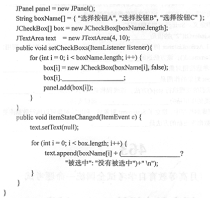 以下是某应用程序定义的两个方法。方法setCheckBoxs(ItemListener listener)已知监视器,产生一组选择按钮,并给他们注册监视器和将它们加入到面板中;方法使用的全局对象有面板panel,存放按钮名称的数组boxName,选择按钮数组box,文本区text。方法itemStateChanged(ItemEvent e)是选择按钮的事件监视方法,当某个选择按钮的选择状态有改变时,监视方法在文本区中显示各选择按钮的选择状态(被选中或没有选中)。