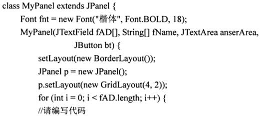 【正确答案】:JLabel al=new JLabel(fName[i],JLabel.RIGHT);al.setFont(fnt);p.add(al);fAD[i]=new JTextField;p.add(fAD[i]);