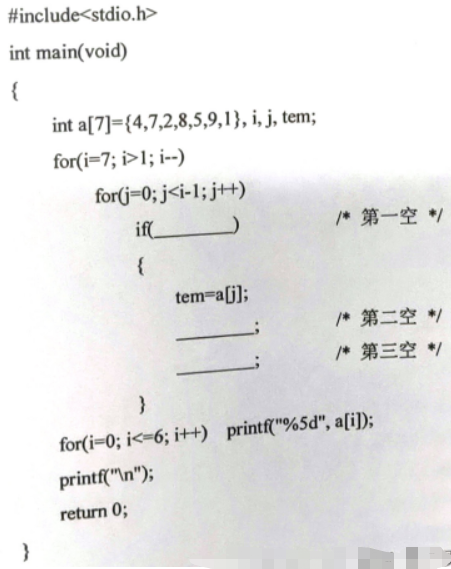 利用冒泡法实现数组元素值降序排序并输出。 作者:高老师 时间:2024-08-04 浏览 0 利用冒泡法实现数组元素值降序排序并输出。【正确答案】:第一空:a[j]第二空:a[j]=a[j+1]第三空:a[j+1]-tem 📱 扫码体验刷题小程序 扫一扫使用我们的微信小程序