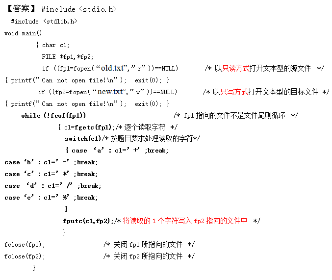 从文本文件old.txt读取字符,将其中的英文字母'a'、'b' 、'c'、'd' 和'e'分别替换为'+'、 '-'、'*'、 作者:高老师 时间:2024-08-04 浏览 0 从文本文件old.txt读取字符,将其中的英文字母'a'、'b' 、'c'、'd' 和'e'分别替换为'+'、 '-'、'*'、'/'、和'%',其余字符不变,然后写入文本文件new.txt.【正确答案】:【题目解析】:处理步骤:(1)打开两个文件;(2)从源文件逐个读取字符----处理字符---将字符写入到目标文件;(3)关闭打开的两个文件。 📱 扫码体验刷题小程序 扫一扫使用我们的微信小程序