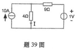 电路如题39图所示。 (1)应用叠加定理,求电流I的值; (2)计算IV电压源对 I的贡献,用百分比表示; (3)只改变10A电流源的值,使得两个电源对I的贡献度相等,求新的电流源值。
