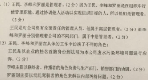 案例:王民是一家造纸公司的经理。公司目前面临着一项起诉:造纸生产排出的废水污染了邻近的河流。为此,王民必须到当地法院应诉。李峰是公司的技术工程部经理,他负责自己部门的工作,并负责与生产部门、销售部门的相互联系和协调。罗丽是公司的办公室主任,主要负责办公室的工作。最近办公室的员工为一张办公桌的位置发生了争执,因为这张办公桌离打印机最远,环境最安静。问题:(1)王民、李峰和罗丽是管理者吗?为什么?他们分别属于哪一层次的管理者?(2)运用管理者角色理论,分析王民、李峰和罗丽各自扮演了什么角色?