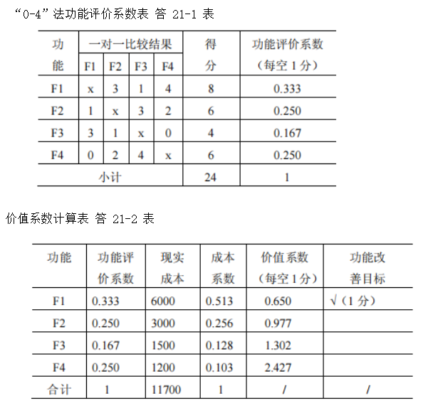 某施工设备有4项功能,其各功能评价系数由“04”法确定,已知见题21-1表,其现实成本已知条件见题21-2表,试完善题21-1表和题21-2表计算该设备各功能的功能评价系数、成本系数和价值系数,并确定该设备的改进目标。