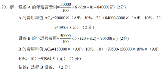 某工厂用5年前购买的设备A生产某产品,当时购置费为100000元,设备A目前的市场价为20000元,估计设备A还能用2年,退役时残值为3000元。现上市了一种新设备B价格为150000元,能使用10年,残值为原值的10%。旧设备A生产100件产品需要6小时,新设备B则需要5小时,该工厂预计今后每年平均能销售50000件产品,该工厂人工费为20元/h。旧设备A动力费为8元/h,新设备B动力费为8.2元/。若基准收益率为10%,试分析该工厂应继续使用旧设备A,还是立即更换新设备B。