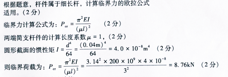 求图示两端简支圆形截面杆件在考虑稳定时的临界力,已知该杆件属于细长杆,弹性模量E=200GPa。正确答案: 作者:高老师 时间:2024-08-04 浏览 0 求图示两端简支圆形截面杆件在考虑稳定时的临界力,已知该杆件属于细长杆,弹性模量E=200GPa。正确答案:【正确答案】:正确答案: 📱 扫码体验刷题小程序 扫一扫使用我们的微信小程序