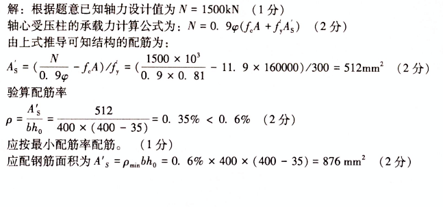 钢筋混凝土轴心受压柱,承受的轴力设计值为N=1500kN,柱的截面尺寸为400mmx400mm,保护层厚度为35mm,计算长度为 作者:高老师 时间:2024-08-04 浏览 3 钢筋混凝土轴心受压柱,承受的轴力设计值为N=1500kN,柱的截面尺寸为400mmx400mm,保护层厚度为35mm,计算长度为3m,稳定系数为0.81,混凝土为C25级(fe=11.9MPa),钢筋为HRB335级(f’y=300MPa),最小配筋率为0.6%,计算该柱所需纵向受压钢筋面积。【正确答案】: 📱 扫码体验刷题小程序 扫一扫使用我们的微信小程序