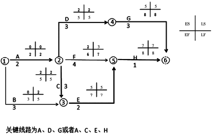 画图正确给 3 分。计算 ES、LS、EF、LF 正确各 2 分,关键线路正确 2 分。