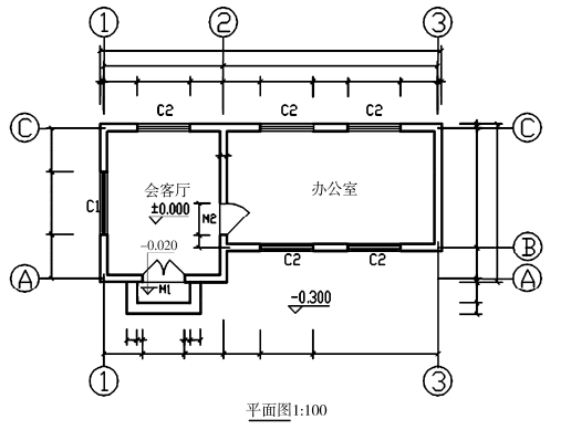 (3)标注室内外地面标高符号。(办公室与室外地坪高差0.3m,与室外台阶顶面高差0.02m)