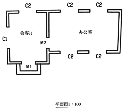 (4)画出门窗的图例(其中M1为1200×2100双扇平开门,M2为900×2100单扇平开门)。