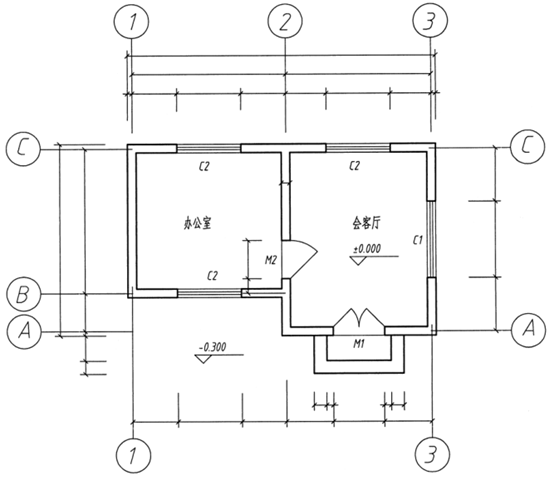 根据下面的平面图,在图上完成下列各项内容:(1)标出定位轴线及编号;(2)标注尺寸(不用写出尺寸数字);(3)标注室内外地面标高符号;(4)画出门的图例(其中M1为1200×200双扇平开门,M2为900×2100单扇平开门)。
