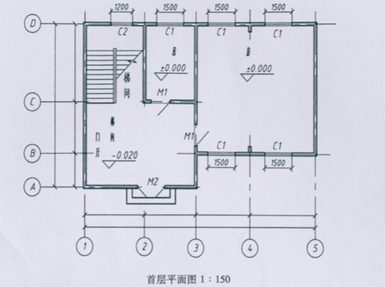 (1)标出各承重构件的纵向和横向轴线编号。(2)标出轴线间的尺寸标注模式和总尺寸的标注模式(无需写出具体尺寸数值):标出所有室内地面标高(各房间地面为零,门厅低20mm) (3)补画门的图例(外门用双扇平开门,其余用单扇平开门,开启方向自定),并 按门窗的代号标出各门窗编号