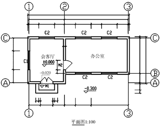 根据下面的平面图,在题22图上完成下列各项内容:(1)标出定位轴线及编号;(2)标注尺寸(不用写出尺寸数字);(3)标注室内外地面标高符号。(办公室与室外地坪高差0.3m,与室外台阶顶面高差0.02m)(4)画出门窗的图例(其中M1为100X2100双扇平开门,M2为900X210单扇平开门)。