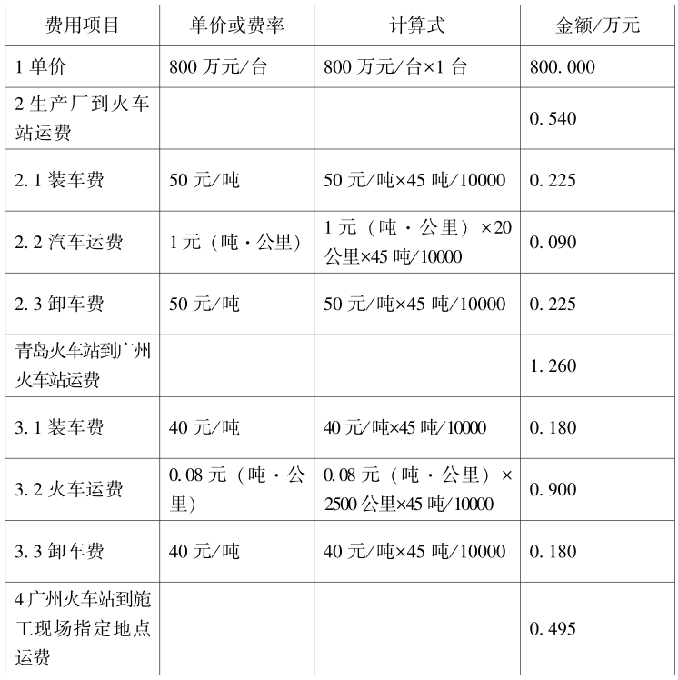 问题:请列表计算1台地铁机车自生产厂出库到安装现场的出库价格。