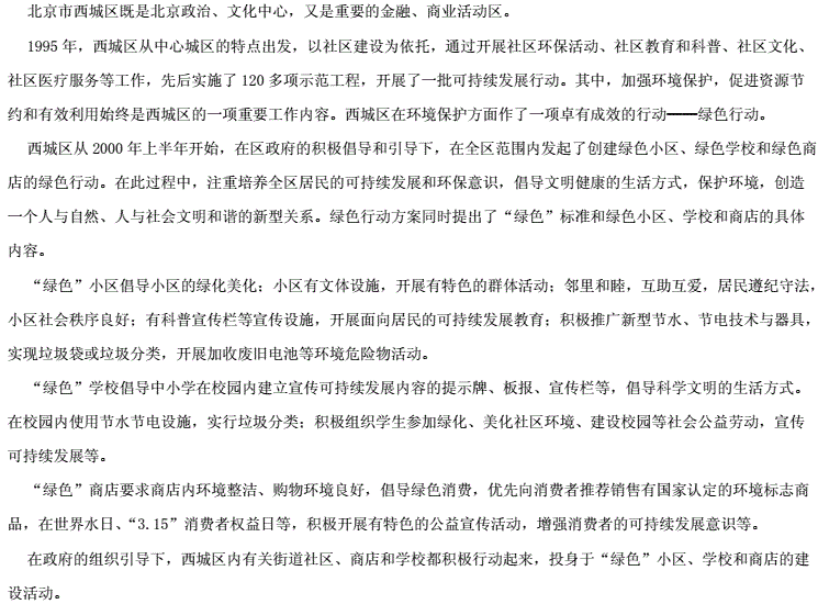 【正确答案】:1.社区是指以一定地域为基础的社会生活共同 体。社区发展指在城乡基层社区中社区居民 依靠社区自身力量,在政府和其他组织机构 的支持下,推动社区有计划地进行社会变迁, 改善社区的经济、社会和文化状况,提髙社区 居民的生活质量。社区建设就是以人们日常 居住和生活的基层社区为载体,通过社区居 民自治,社医与政府、企业和其他社会组织共 同合作,来建立一个与现代社会保障体系、现 代城市管理制度和社会化服务网络相适应的 社区支持系统。2.北京市西城区的绿色行动,充分体现了现代 社会社E建设和社E发展的理念。从社区的 全方位建设人手,用可持续发展思想指导社区的各项工作,充分动员了各类社E主体和 社区力量(包括政府、社会组织、学校、商店、 企业以及群众)共同建设自己的社区,发挥了 社会各界的积极性,体现了社区建设工作的 综合性、社会性、区域性和计划性。而且“绿 色”行动具体活动内容的选择,贴近现实需 要,便于群众參与,使社区居民、学生、工作人 员和消费者都意识到可持续发展和环境保护 的重要性,井能够“从我做起、从小事做起”, 投身于可持续发展事业。“绿色”行动由于政 府的推动カ度大,公众参与广泛,可操作性 强,具有较高的参考价值。它的意义不仅在 于使当地居民可持续发展的意识大幅度提 高,改善了西城区的生活环境,取得了很好的 社会效益,更重要的是为城市社E的可持续 发展探索了一条有价值的发展模式,是我国 大城市可持续发展社区建设很好的示范。