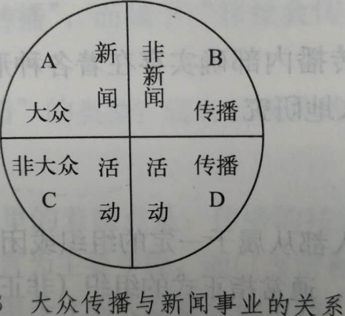 从大众传播和非大众传播、新闻活动和非新闻活动这两个视角出发,可得出如下结论: A=新闻事业,由此,传播学、大众 传播学和新闻学这三门学科的关系,以及它们各自的研究对象,也就明确了。即传播学=ABCD,大众传播学=AB,新闻学=AC(以A为主)。