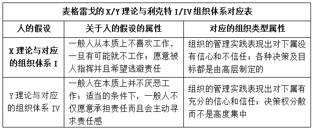 本题考查利克特的组织体系Ⅰ。考生需明确其与麦格雷戈关于人的假设之间的对应关系。
