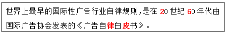 世界上最早的国际性广告行业自律规则,是在20世纪60年代由国际广告协会发表的《( )》。 作者:高老师 时间:2024-08-06 浏览 0 世界上最早的国际性广告行业自律规则,是在20世纪60年代由国际广告协会发表的《( )》。【正确答案】:广告自律白皮书【题目解析】:助记:驴皮是二流子——驴(律)皮是二(2)流(6)子。 📱 扫码体验刷题小程序 扫一扫使用我们的微信小程序