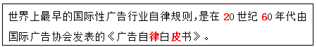 世界上最早的国际性广告行业自律规则,是在( )由国际广告协会发表的《广告自律白皮书》。 作者:高老师 时间:2024-08-06 浏览 0 世界上最早的国际性广告行业自律规则,是在( )由国际广告协会发表的《广告自律白皮书》。【正确答案】:20世纪60年代【题目解析】:助记:驴皮是二流子——驴(律)皮是二(2)流(6)子。 📱 扫码体验刷题小程序 扫一扫使用我们的微信小程序