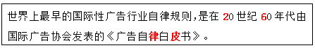 世界上最早的国际性广告行业自律规则,是在20世纪60年代由国际广告协会发表的《( )》。 作者:高老师 时间:2024-08-06 浏览 1 世界上最早的国际性广告行业自律规则,是在20世纪60年代由国际广告协会发表的《( )》。【正确答案】:广告自律白皮书【题目解析】:助记:驴皮是二流子——驴(律)皮是二(2)流(6)子。 📱 扫码体验刷题小程序 扫一扫使用我们的微信小程序