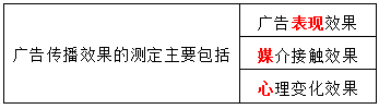 广告传播效果的测定主要包括广告表现效果、媒介接触效果和( )等方面的内容。 作者:高老师 时间:2024-08-06 浏览 0 广告传播效果的测定主要包括广告表现效果、媒介接触效果和( )等方面的内容。 【正确答案】:心理变化效果【题目解析】:助记:没(媒)心表现。 📱 扫码体验刷题小程序 扫一扫使用我们的微信小程序
