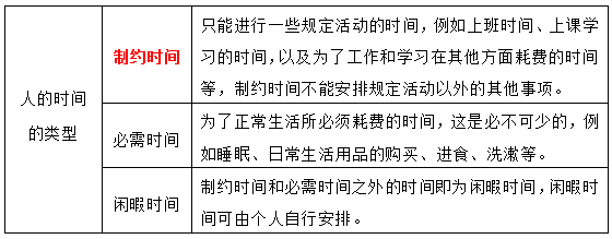 上班时间、上课学习的时间,以及为了工作和学习在其他方面耗费的时间等,属于人的() 作者:高老师 时间:2024-08-06 浏览 0 上班时间、上课学习的时间,以及为了工作和学习在其他方面耗费的时间等,属于人的()A、制约时间B、必需时间C、闲暇时间D、娱乐时间【正确答案】:A【题目解析】:D选项为无关干扰项。故本题正确答案为:A 📱 扫码体验刷题小程序 扫一扫使用我们的微信小程序