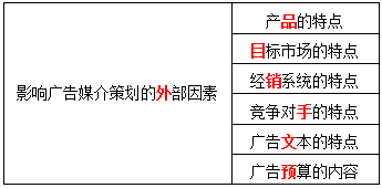 影响广告媒介策划的外部因素主要包括:( )的特点;目标市场的特点;经销系统的特点;竞争对手的特点;广告文本的特点;广告预算的内容。