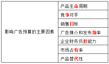 影响广告预算的主要因素包括:产品生命周期;( );销售目标;广告媒介和发布频率;企业财务负担能力;市场占有率;产品替代性。