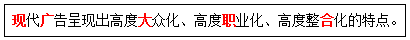 现代广告呈现出高度大众化、( )、高度整合化的特点。 作者:高老师 时间:2024-08-06 浏览 3 现代广告呈现出高度大众化、( )、高度整合化的特点。【正确答案】:高度职业化【题目解析】:助记:先逛大纸盒——先(现)逛(广)大纸(职)盒(合)。 📱 扫码体验刷题小程序 扫一扫使用我们的微信小程序
