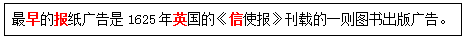 最早的报纸广告是1625年英国的《( )》刊载的一则图书出版广告。 作者:高老师 时间:2024-08-06 浏览 0 最早的报纸广告是1625年英国的《( )》刊载的一则图书出版广告。【正确答案】:信使报【题目解析】:助记:早报音(英)信。 📱 扫码体验刷题小程序 扫一扫使用我们的微信小程序