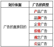 产品广告、品牌广告、企业广告、价格广告、观念广告、公益广告