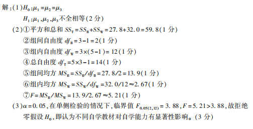 为探讨3种不同的自学教材对学生自学能力的影响,采用单因素随机实验设计,随机抽取3组学生为被试(每组5人)。被试自学3个月后进行第一次测验,结果如下: