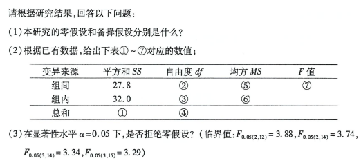 假设测验成绩均服从正态分布,且总体方差相等,研究者对上述结果进行了方差分析。