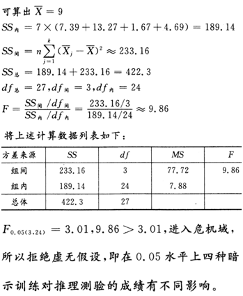 解:(1)设H0:这四种暗示训练对推理测验的成绩无不同影响; H1:这四种暗示训练对推理测验的成绩有不同影响。根据题中表内数据可列表如下: