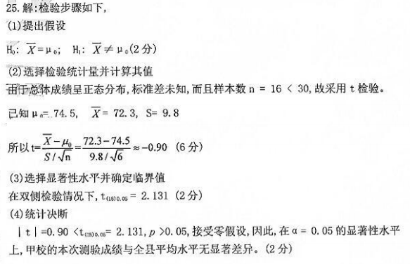 某县中学生地理测试的总体成绩呈正态分布,平均分为74.5.该县甲校16名学生在本次测验的平均分为72.3,标准差为9.8。问:在 作者:高老师 时间:2024-08-06 浏览 1 某县中学生地理测试的总体成绩呈正态分布,平均分为74.5.该县甲校16名学生在本次测验的平均分为72.3,标准差为9.8。问:在α=0.05的显著性水平上,甲校本次测验的成绩与全县的平均水平是否有显著差异?(双侧检验情况下,t(15)0.05=2.131,t(16)0.05=2.120.计算结果保留两位小数。)【正确答案】: 📱 扫码体验刷题小程序 扫一扫使用我们的微信小程序