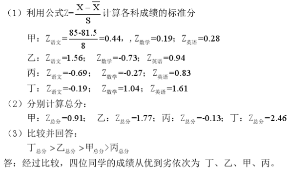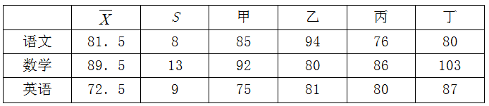 假定某市初二学生参加标准化语文、数学和英语测验,所得三科成绩均接近正态分布,各科的平均分、标准差及其中四位学生的各科成绩列于下表,试计算这四位学生各科成绩的标准分并比较他们总成绩的优劣。(结果保留到小数点后两位数。)