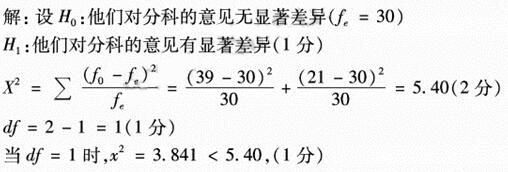 因此,在0.05的显著性水平上拒绝虚无假设,接受备择假设。可以推论说,学生对高中文理分科的意见有显著差异。(1分)随机抽取60名学生,询问他们对高中文理分科的意见,赞成分科的有39人,反对的有21人。问:他们对分科的意见是否有显著差异?(结果保留两位小数)