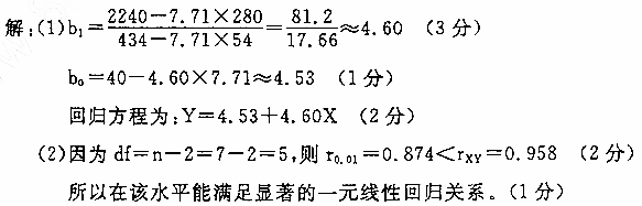 (2)从题34表中数据算得变量X与变量Y的相关系数为下限r(下标xy)=0.958,取自由度df=n-2,在0.01水平下,问变量Y与变量x之间是否存在着显著的一元线性回归关系。
