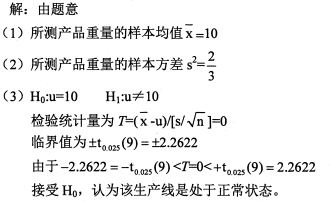 从某生产线上随机抽取10件产品,测得他们的重量分别为10、9、11、9、10、9、11、10、11、10克。正常生产情况下产品重 作者:高老师 时间:2024-08-07 浏览 0 从某生产线上随机抽取10件产品,测得他们的重量分别为10、9、11、9、10、9、11、10、11、10克。正常生产情况下产品重量服从均值为10克的正态分布。(1)求所测产品重量的样本均值;(2)求所测产品重量的样本方差;(3)以95%的可靠程度检验该生产线是否处于正常状态?给出相应的原假设、备择假设及检验统计量。(已知t0.025(9)=2.2622,t0.05(9)=1.8331,t0.05(10)=2.2281,t0.05(10)=1.8125)【正确答案】: 📱 扫码体验刷题小程序 扫一扫使用我们的微信小程序