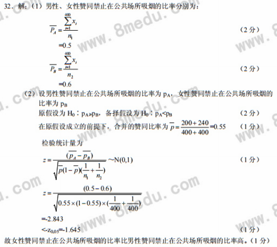 对某城市禁止在公共场所吸烟的调查中,接受调查的400名男性中有200人赞同禁止在公共场所吸烟,接受调查的400名女性中有240人 作者:高老师 时间:2024-08-07 浏览 2 对某城市禁止在公共场所吸烟的调查中,接受调查的400名男性中有200人赞同禁止在公共场所吸烟,接受调查的400名女性中有240人赞同禁止在公共场所吸烟。 (1) 求男性、女性赞同禁止在公共场所吸烟的比例。(4分) (2) 关于禁止在公共场所吸烟,女性赞同的比例是否显著高于男性(可靠性取95%)?给出相应假设检验的原假设和备择假设(6分)(Z0.05=1.645,Z0.025=1.96)【正确答案】: 📱 扫码体验刷题小程序 扫一扫使用我们的微信小程序