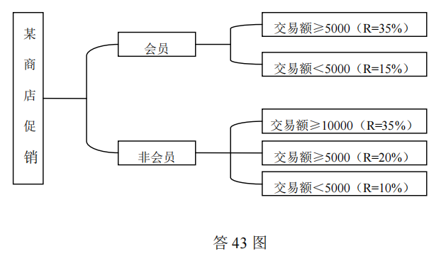 某商店促销活动,根据交易金额分别针对会员和非会员实施不同的折扣,规则如下:会员交易颜5000元(含)以上折扣率为35%,交易额不 作者:高老师 时间:2024-08-07 浏览 0 某商店促销活动,根据交易金额分别针对会员和非会员实施不同的折扣,规则如下:会员交易颜5000元(含)以上折扣率为35%,交易额不足5000元折扣率为15%;非会员交易额10000元(含)以上折扣率为35%,交易额5000元以上(含)但不足10000元折扣率为20%,交易额不足5000元折扣率为10%。请绘出该商店促销活动折扣决策树。【正确答案】: 📱 扫码体验刷题小程序 扫一扫使用我们的微信小程序