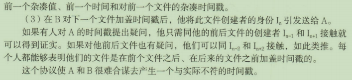 A不用担心他的文件内容会泄露出去,因为杂凑函数是单向函数,而且具有足够的安全性。此外,B也不用存储文件的拷贝(甚至杂凑函数值),无须大容量存储器。A可以马上检查在第(4)步中接收到的时间戳是否正确,及时发现传送过程中所造成的误码。这里存在的一个问题是A和B仍然可以合谋生成任何想要的时间戳。
