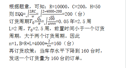 某智能制造企业,每年天猫商城销售4000台机器人,每次订货的成本为200元,每台机器人的库存持有成本每年40元,如果前置时间为2 作者:高老师 时间:2024-08-07 浏览 1 某智能制造企业,每年天猫商城销售4000台机器人,每次订货的成本为200元,每台机器人的库存持有成本每年40元,如果前置时间为2周,请制定再订货政策。(一年按50周计算)【正确答案】: 📱 扫码体验刷题小程序 扫一扫使用我们的微信小程序