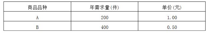 某企业从同一供应商处订购5种商品,每种商品的单价和年需求量如下表所示,假如订购成本为每份订单2元,对于每一品种为0.4元,年储存成本率为40%,如果前置时间为7天,求经济订货间隔时间和每种商品的最高库存量。 题42表 某企业商品需求情况