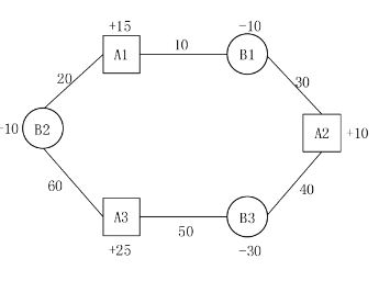 某商品的供应地和需要地各3个,位于环状的路网上,各供应地和需要地的距离及供应地的供应量、需要地的需要量如图所示。问如何规划运输方案才能使运输的吨公里最小?最小吨公里为多少? 题41图 某商品的供应地和需要地网络图