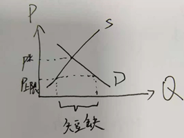 2. 第二种情况是限制性的最高限价。最高限价对市场是有一种限制性约束的,额外的需求者买不到商品。
